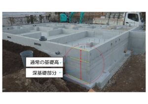 深基礎とは、添付写真の様に法面地等で通常の基礎での施工が厳しい高低差がある時に施工する方法です。