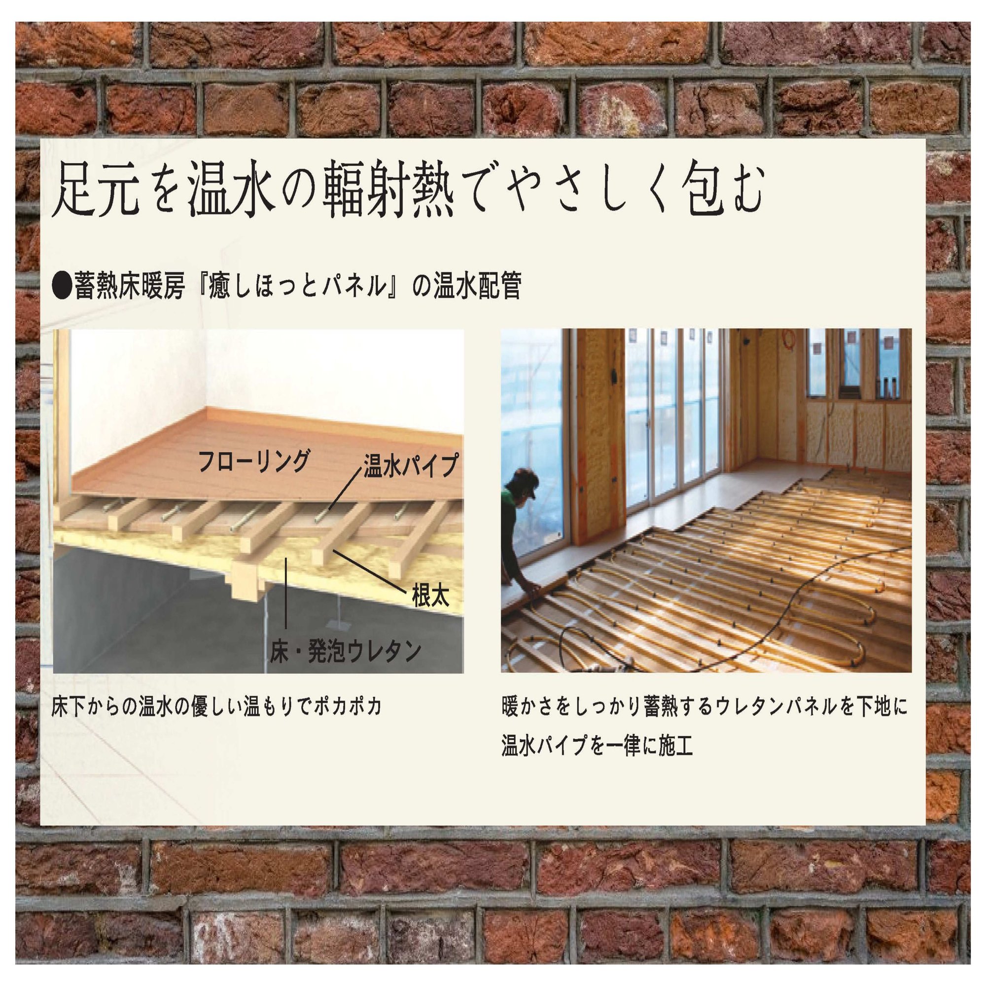 夏の遮熱による涼しさと共に、私たちは寒さに克つための冬の快適性も妥協しません。熱を逃がさない高い断熱性能に加え、私たちが追求したのは、足元からじんわりと温まる究極の冬の快適さです。